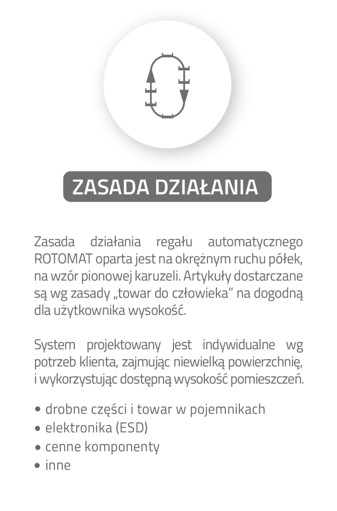 Regały karuzelowe Rotomat pozwalają na przechowywanie małych, drobnych części i narzędzi w specjalnych pojemnikach, chroniąc je przed zabrudzeniem i uszkodzeniem. Pojemniki, wkładki, przekładki służące do segregacji mają zróżnicowane wymiary – możliwości wyboru są nieograniczone. Dostęp do towaru jest kontrolowany, gwarantując tym samym bezpieczeństwo składowania cennych elementów.